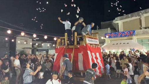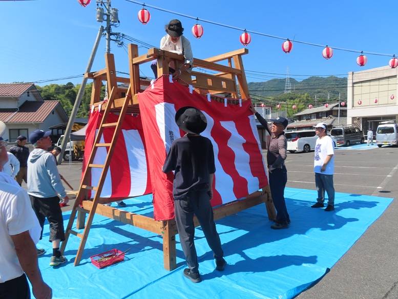 猛暑の中、早朝より提灯の設置、ヤグラの