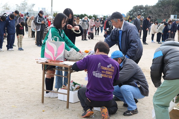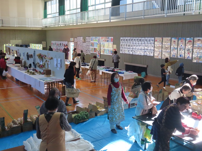 作品展野菜売り場、即売用の野菜を前にした役員の皆さん